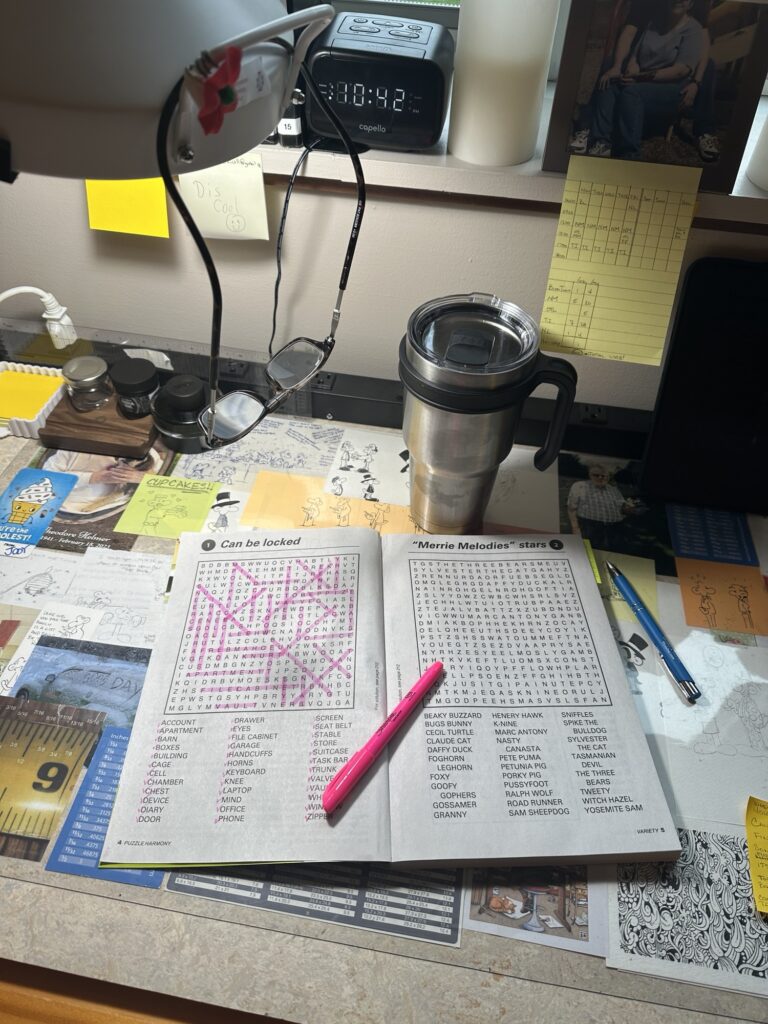 I stood up for a minute, stretched, sipped from my cup and sat back down again. It then occurred to me to go on to the next word. You see there are no rules, a timeframe, or even a plan on how to finish it so, I moved on and found every other word in the puzzle. I even managed to find words out of order. They were just popping out at me! How weird is that?